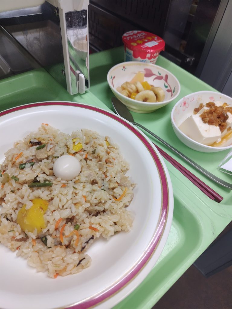 今日は、先日写真を撮っておいたメニューを紹介します。この日は、職員Gさん所有の栗林で収穫された栗を使った中華おこわです。