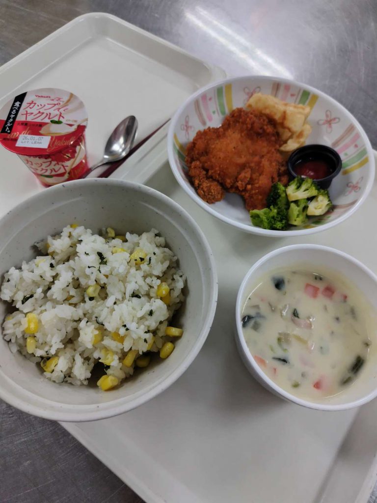 コーンライス、サクサクのフライドチキン&ポテト、たっぷりのクラムチャウダーです。デザートには、リッチなミルク感が特徴のカップdeヤクルトを選んでみました。